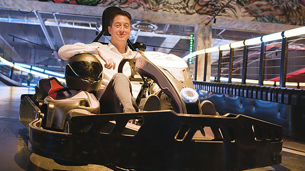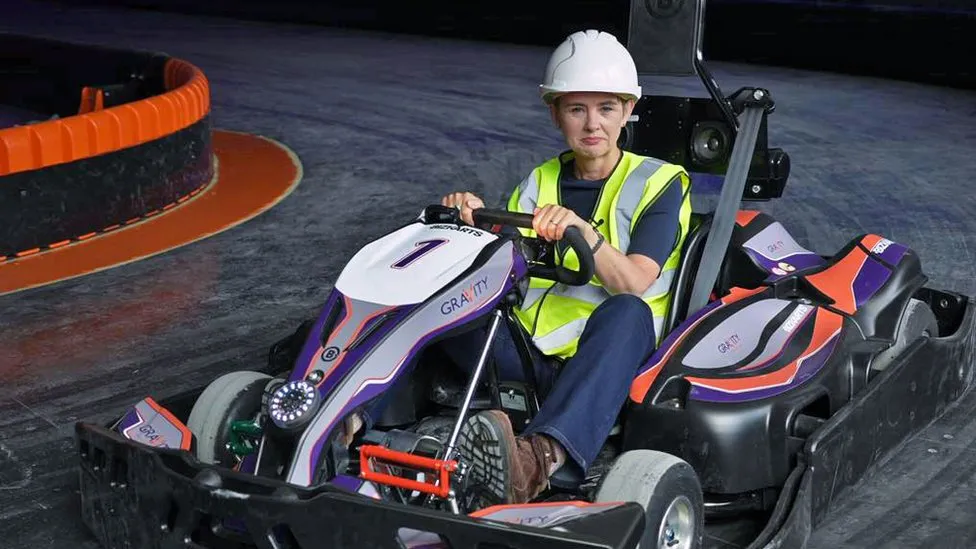 BBC business correspondent Emma Simpson tries out go-karting on a track in a former Debenhams beauty hall.